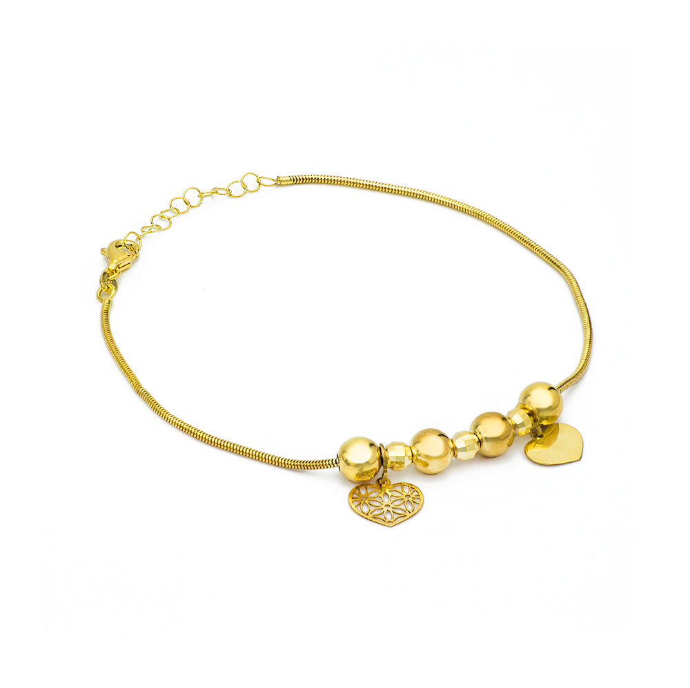 Descoperiți eleganța atemporală a acestei brățări din aur 14K, o bijuterie rafinată care îmbină perfect delicatețea bilelor cu farmecul pandantivelor ajurate și al inimii pline. Fiecare detaliu este meticulos lucrat, reflectând măiestria artizanală și pasiunea pentru creații unice.