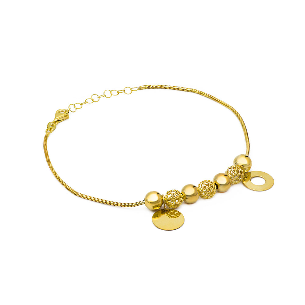 Descoperiți eleganța atemporală a acestei brățări din aur 14K, o bijuterie rafinată ce îmbină delicatețea bilelor cu strălucirea pandantivelor în formă de inel și cerc complet. Fiecare detaliu este meticulos lucrat, o mărturie a măiestriei artizanale și a pasiunii pentru frumos.