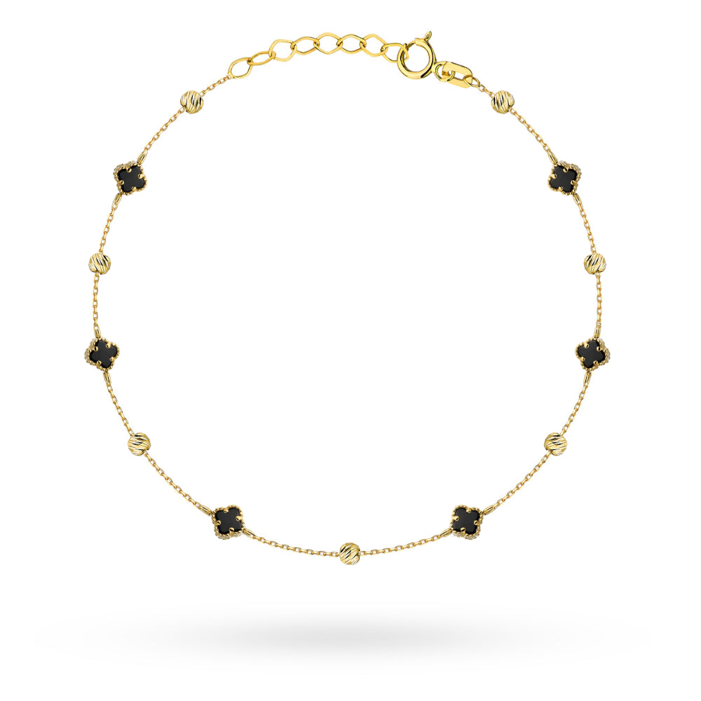 Această brățară este mai mult decât un simplu accesoriu; este o declarație de stil. Trifoiul negru adaugă o notă de mister și eleganță, în timp ce biluțele diamantate (stilizate) captează lumina, creând un joc subtil de strălucire. Perfectă pentru a completa o ținută de zi sau de seară, această brățară este o alegere ideală pentru femeia care apreciază frumusețea și rafinamentul.