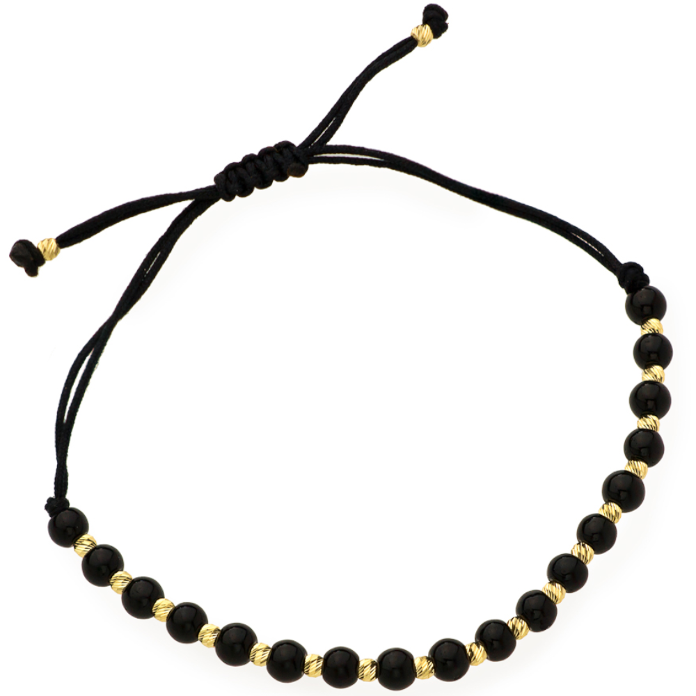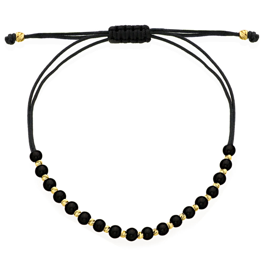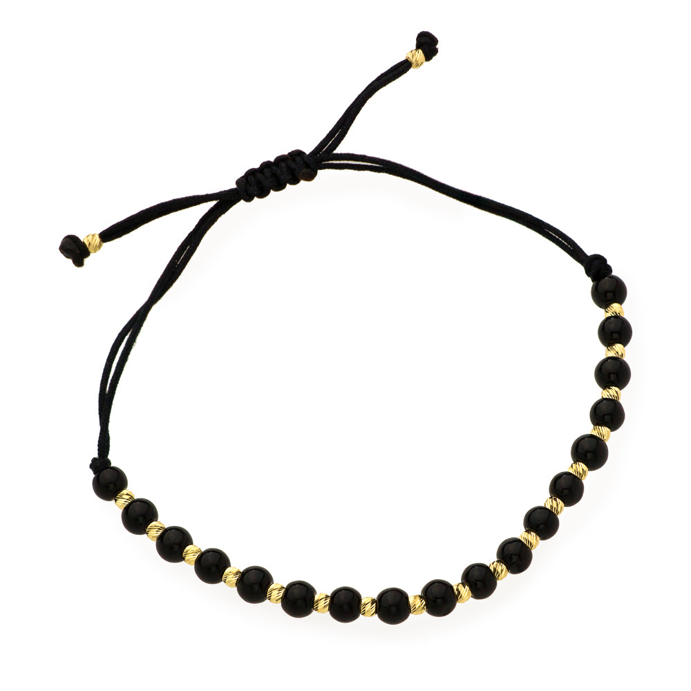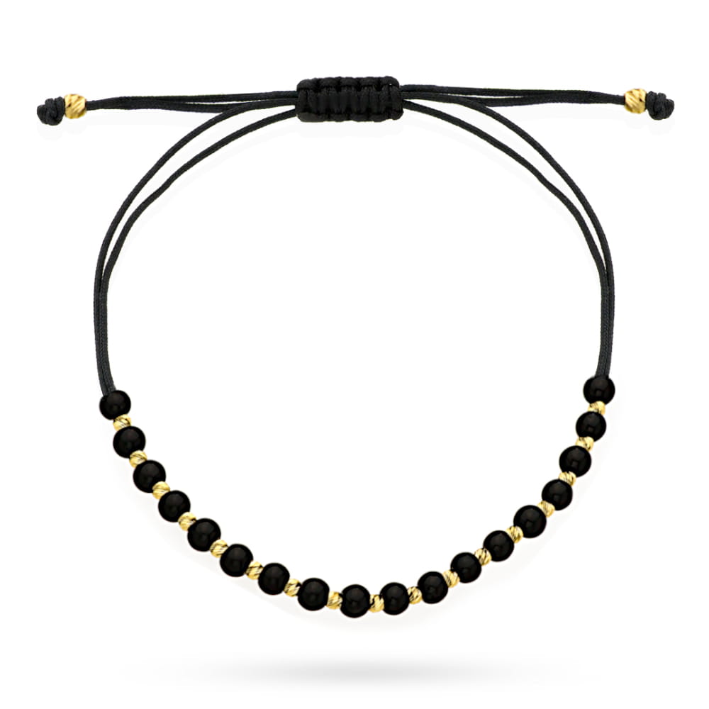 Această brățară este mai mult decât un simplu accesoriu; este o declarație de stil. Mărgelele aurii, fin lucrate, se îmbină perfect cu cele negre, creând un contrast subtil și sofisticat. Șnurul negru adaugă o notă de modernitate, făcând această brățară potrivită pentru orice ocazie, de la evenimente speciale la ținutele de zi cu zi. Designul reglabil asigură o potrivire perfectă, oferind confort și eleganță.