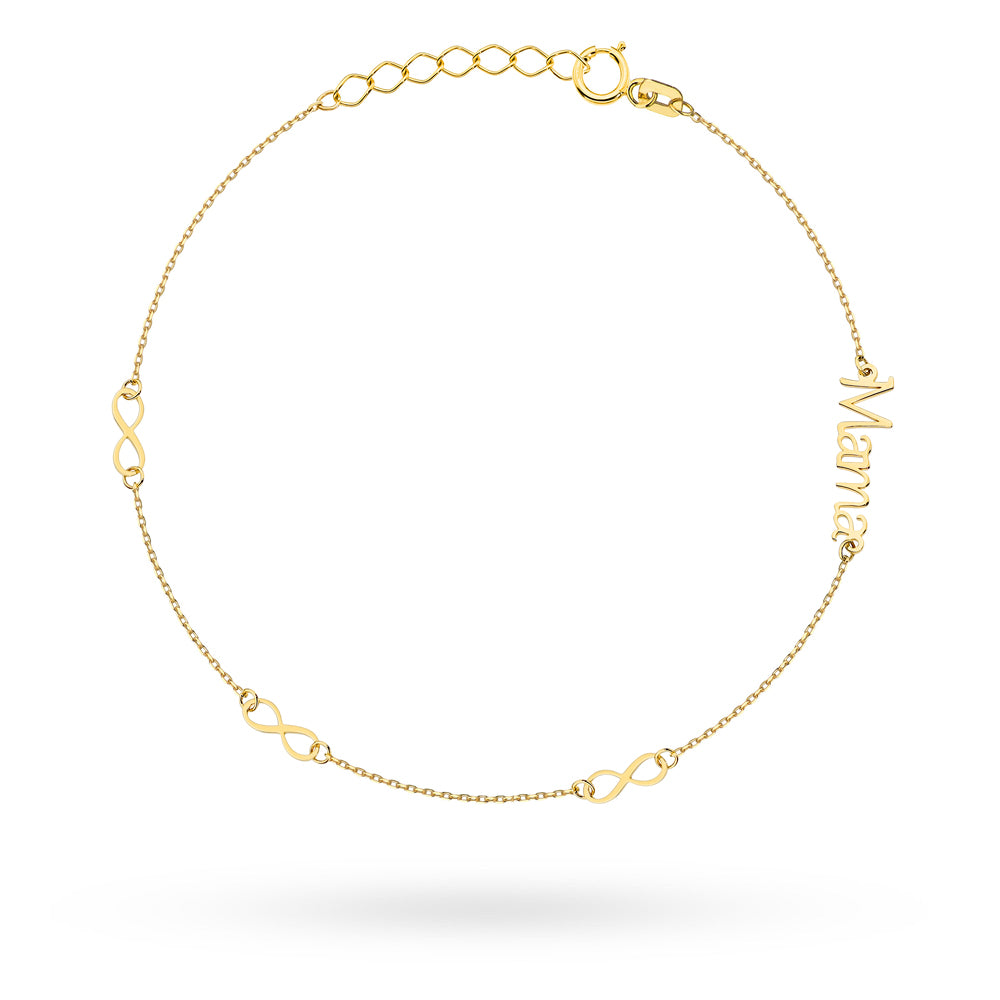 Descoperă eleganța atemporală a acestei bratari din aur, o declarație delicată de afecțiune și stil. Această bijuterie fină îmbină perfect simbolul infinitului cu cuvântul "Mama", creând un cadou cu o semnificație profundă și personală.