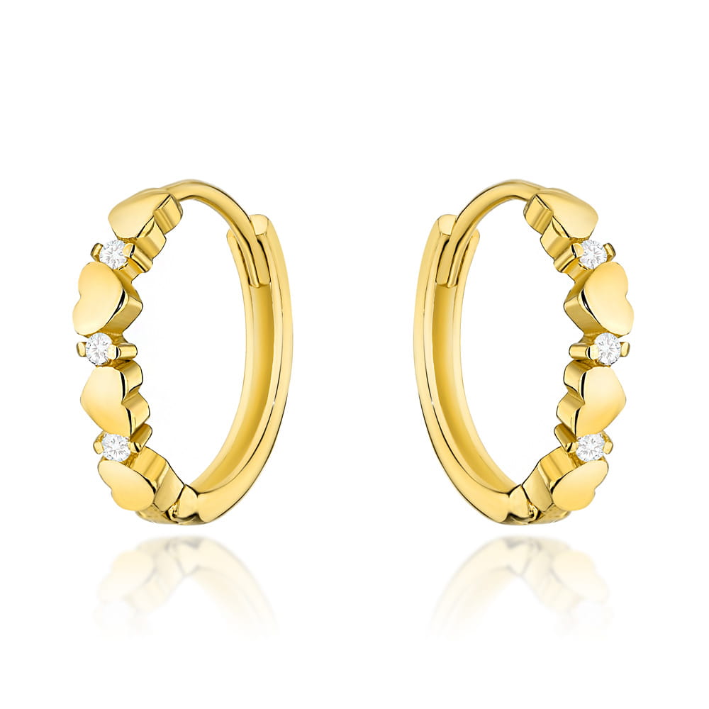Adaugă o notă de strălucire și eleganță aspectului tău cu acești cercei din aur 14K (585) cu inimioare și zirconii albe.