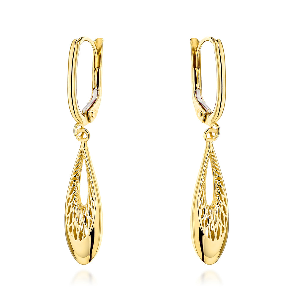 Acești cercei sunt mai mult decât o bijuterie; sunt o declarație de stil. Fiecare detaliu este meticulos lucrat, de la forma grațioasă de lacrimă la finisajele impecabile. Aurul galben strălucitor captează lumina, oferind un efect vizual spectaculos. Perfecti pentru a fi purtați la ocazii speciale sau pentru a adăuga o notă de eleganță în viața de zi cu zi. Un cadou minunat pentru o persoană dragă, sau un răsfăț pentru tine.
