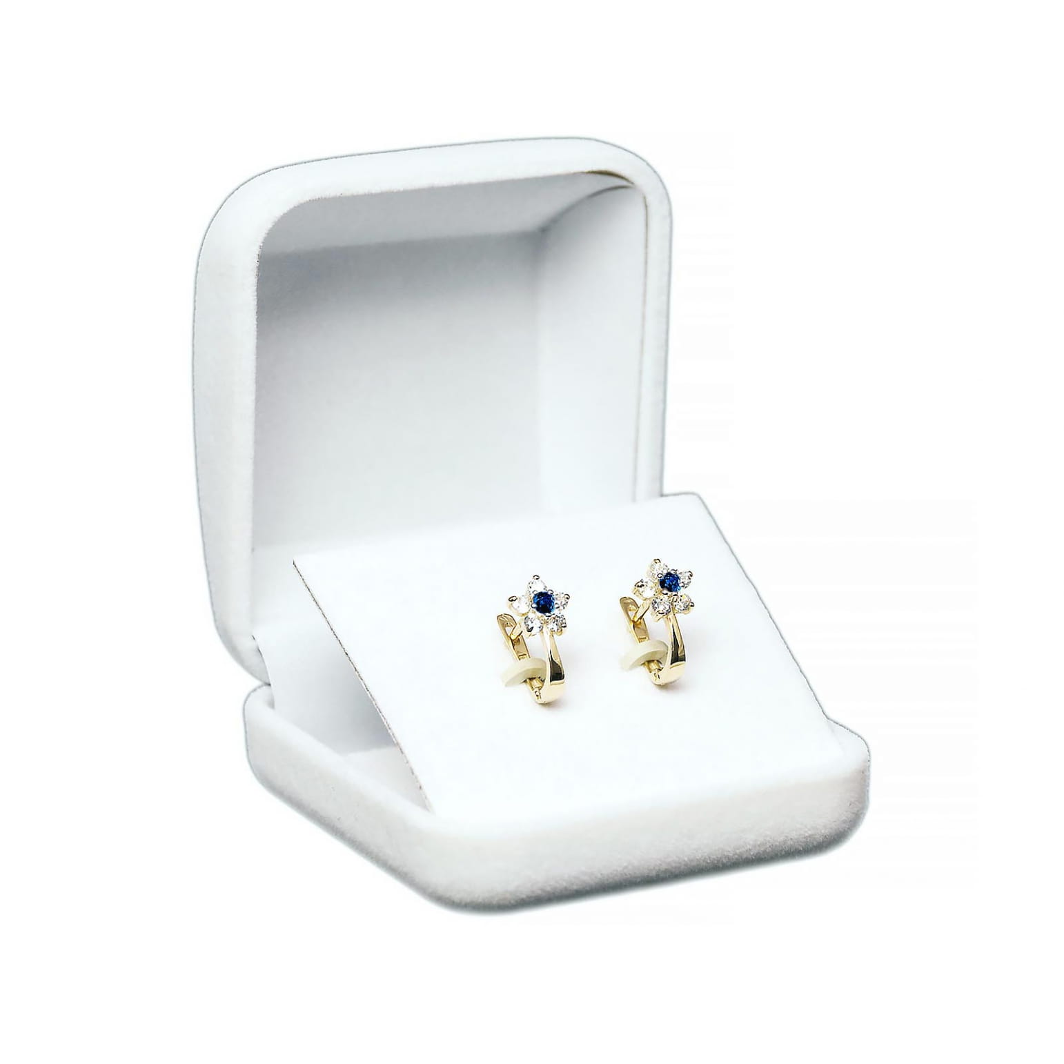 Acești cercei din aur 8K, meticulos lucrați, prezintă zirconii albastre strălucitoare, dispuse într-un model floral încântător. Cu un sistem de închidere tip șurub, acești cercei oferă atât siguranță, cât și un plus de eleganță. Sunt bijuteria perfectă pentru a adăuga o notă subtilă de rafinament și romantism oricărei ținute.