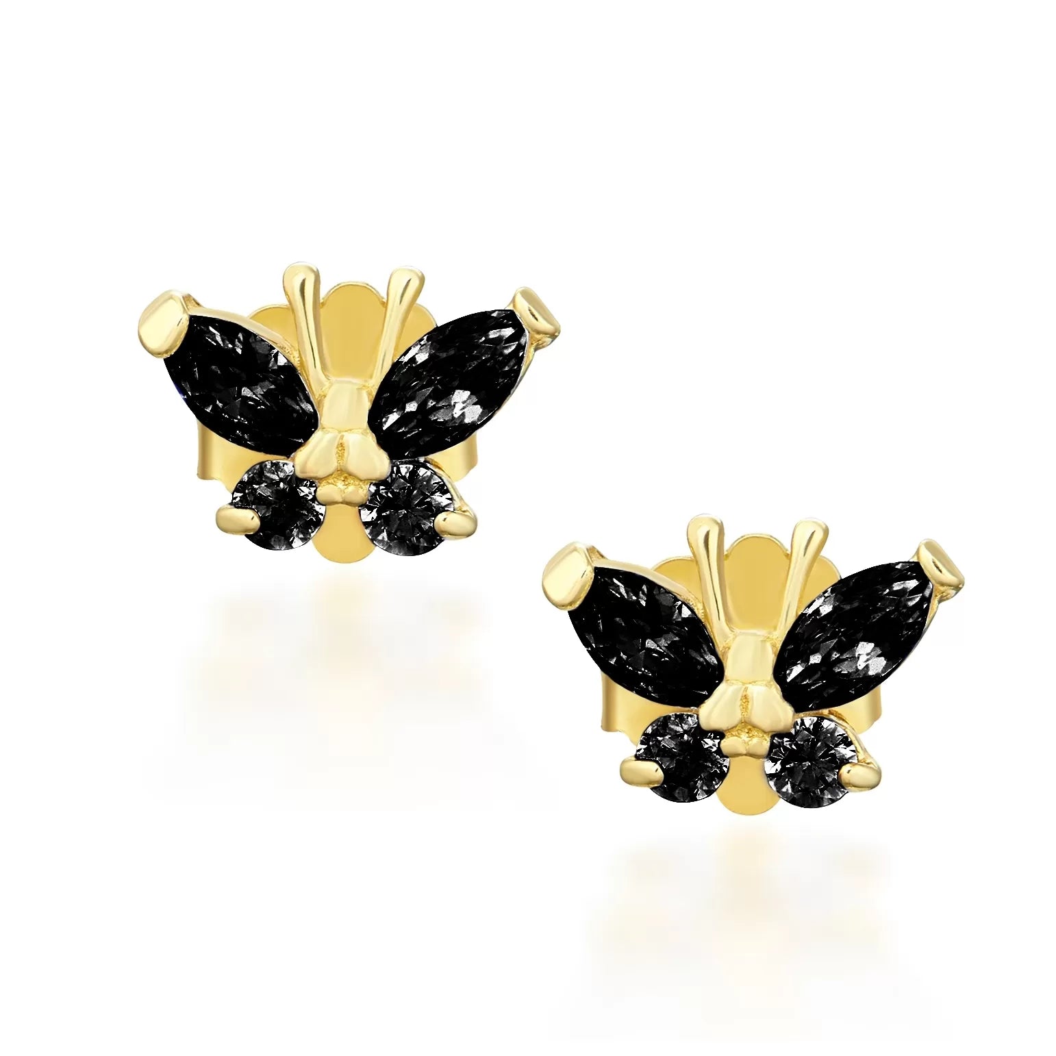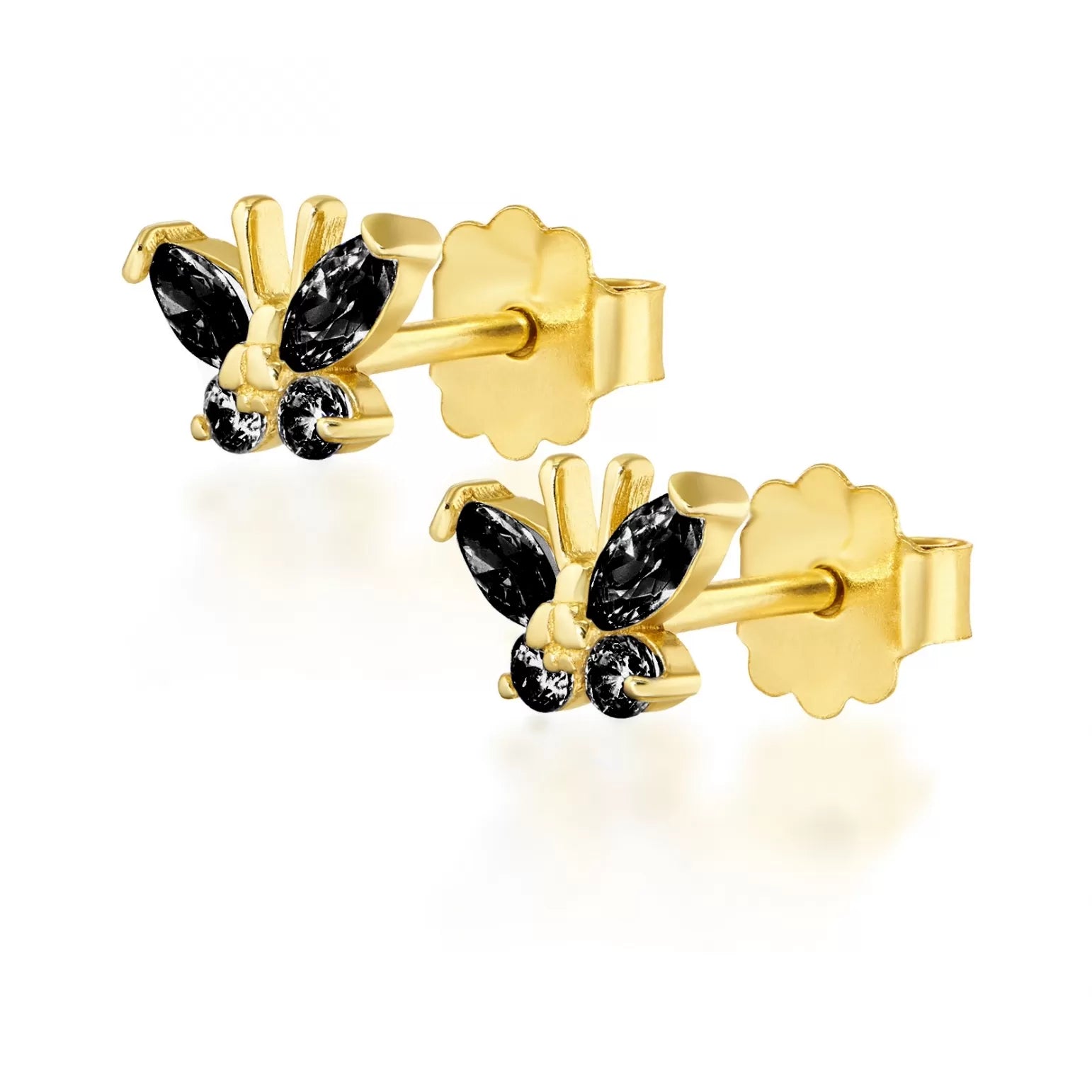 Descoperiți eleganța subtilă și rafinamentul acestor cercei din aur 8K, în formă de fluturi delicați. Perfecți pentru a adăuga o notă de grație și feminitate oricărei ținute, acești cercei sunt bijuteria ideală pentru a vă completa stilul unic. Strălucirea subtilă a aurului galben se îmbină armonios cu zirconiile negre, creând un contrast captivant și sofisticat.