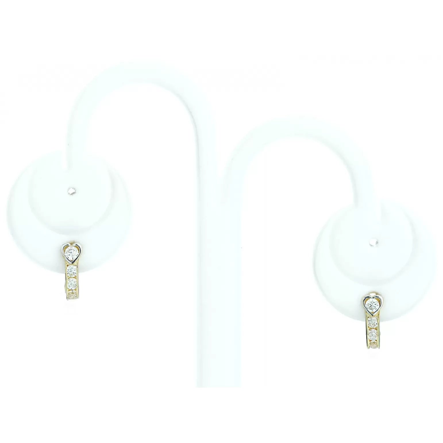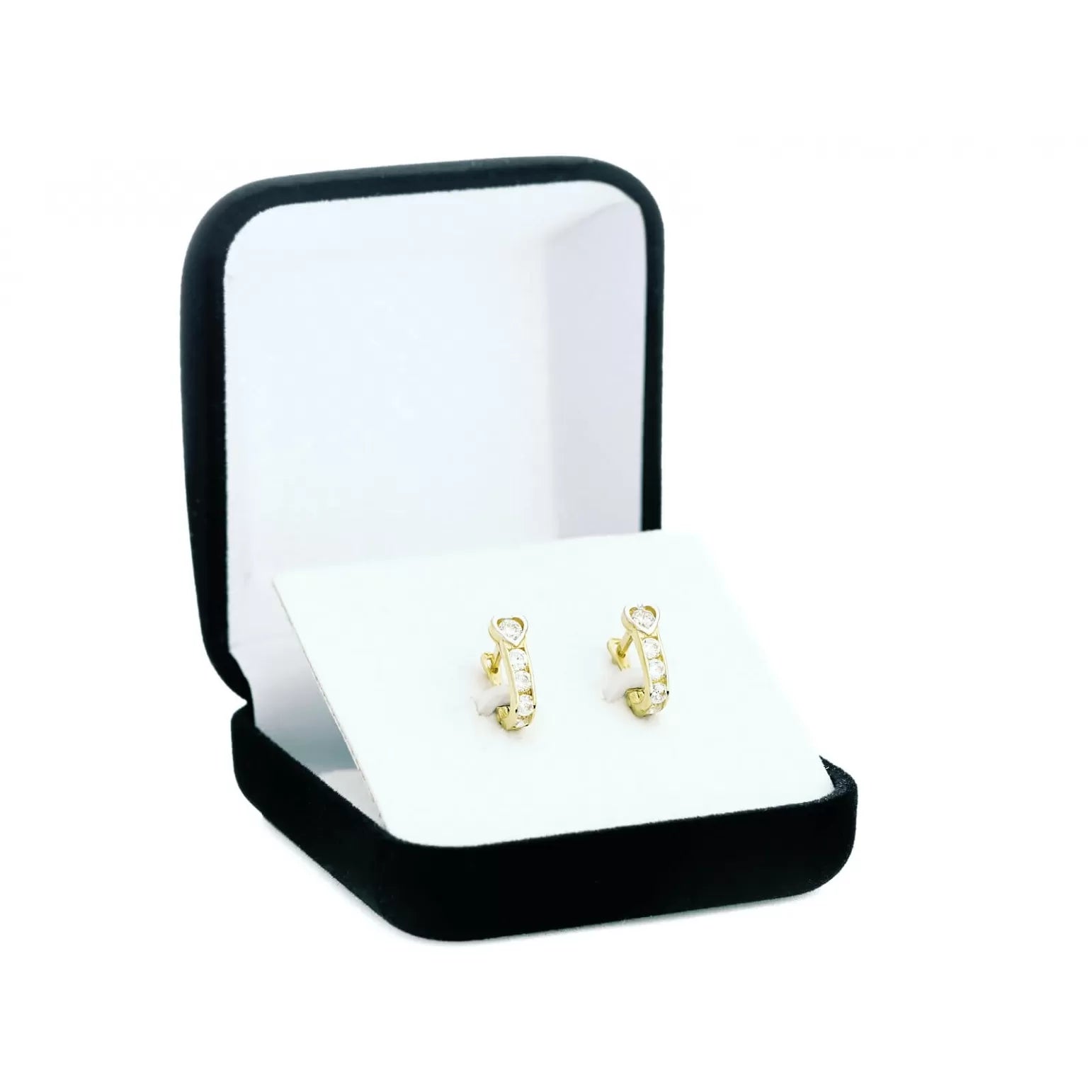 Descoperiți eleganța și rafinamentul acestor cercei din aur 8K, realizați cu o precizie desăvârșită. Delicatul pandantiv în formă de inimă, împodobit cu zirconii albe strălucitoare, adaugă o notă de romantism și feminitate oricărei ținute. Sistemul de închidere tip șurub asigură confort și siguranță pe tot parcursul zilei. Un cadou perfect pentru a surprinde o persoană dragă.