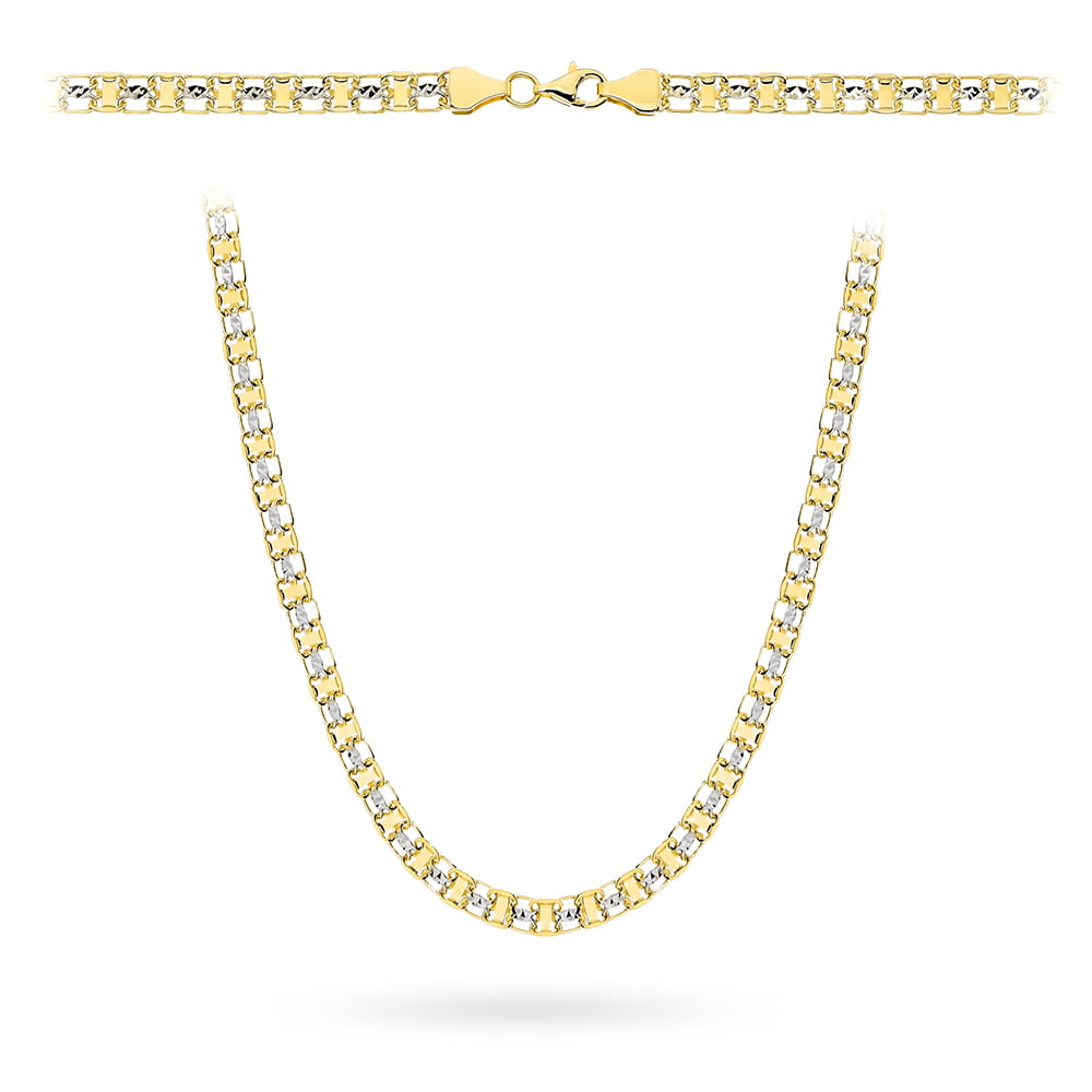 Acest colier rafinat, din colecția exclusivistă "Piatto", este o adevărată operă de artă. Realizat cu măiestrie din aur de 14K (585), colierul strălucește în două nuanțe de aur, completate de delicate diamante. Designul său unic, cu o formă deosebită, emană o eleganță subtilă, perfectă pentru a completa orice ținută, de la cea casual la cea de seară.