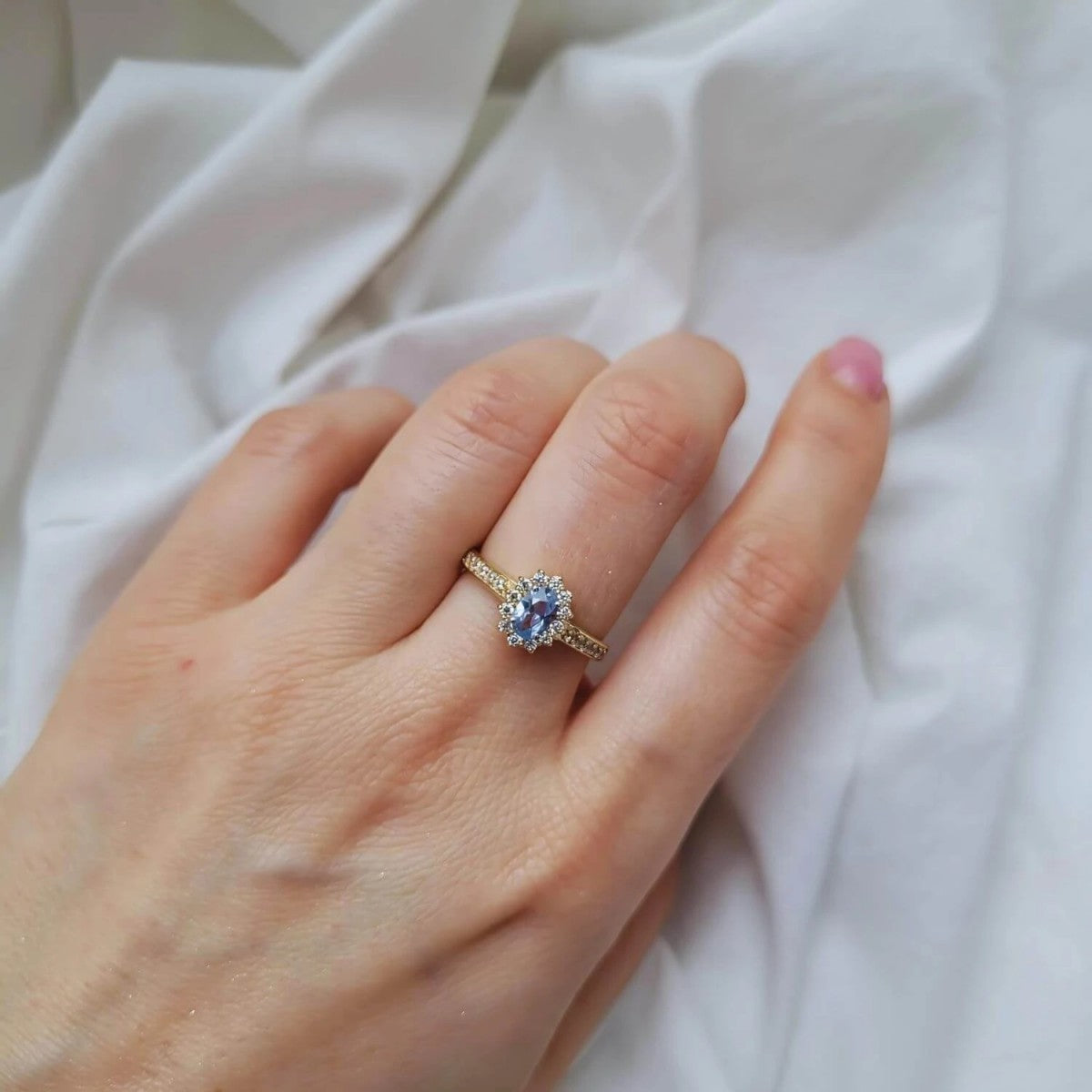 Descoperă eleganța atemporală a acestui inel din aur, o bijuterie rafinată, concepută pentru a completa perfect stilul tău. Acest inel îmbină cu măiestrie strălucirea aurului de 8K cu farmecul unei pietre albastre și a zirconiilor, creând o piesă de excepție.