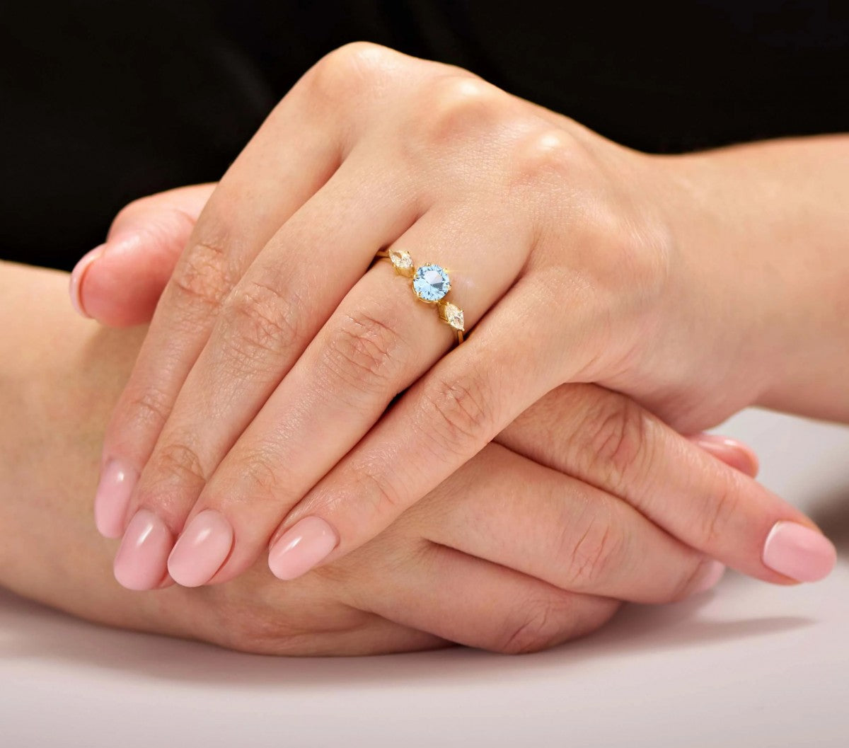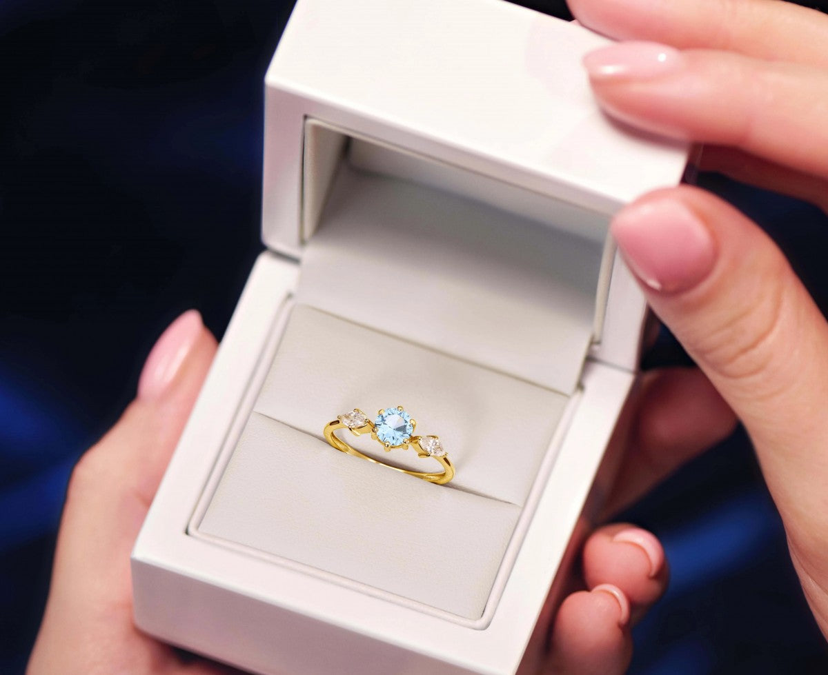 Acest inel încântător este realizat cu măiestrie din Aur 8K, reflectând o calitate superioară și un design sofisticat. Piatra albastră centrală, cu forma sa distinctivă, adaugă o notă de mister și eleganță. Greutatea variază între ~1,15 - 1,60g, oferind o senzație plăcută pe deget.