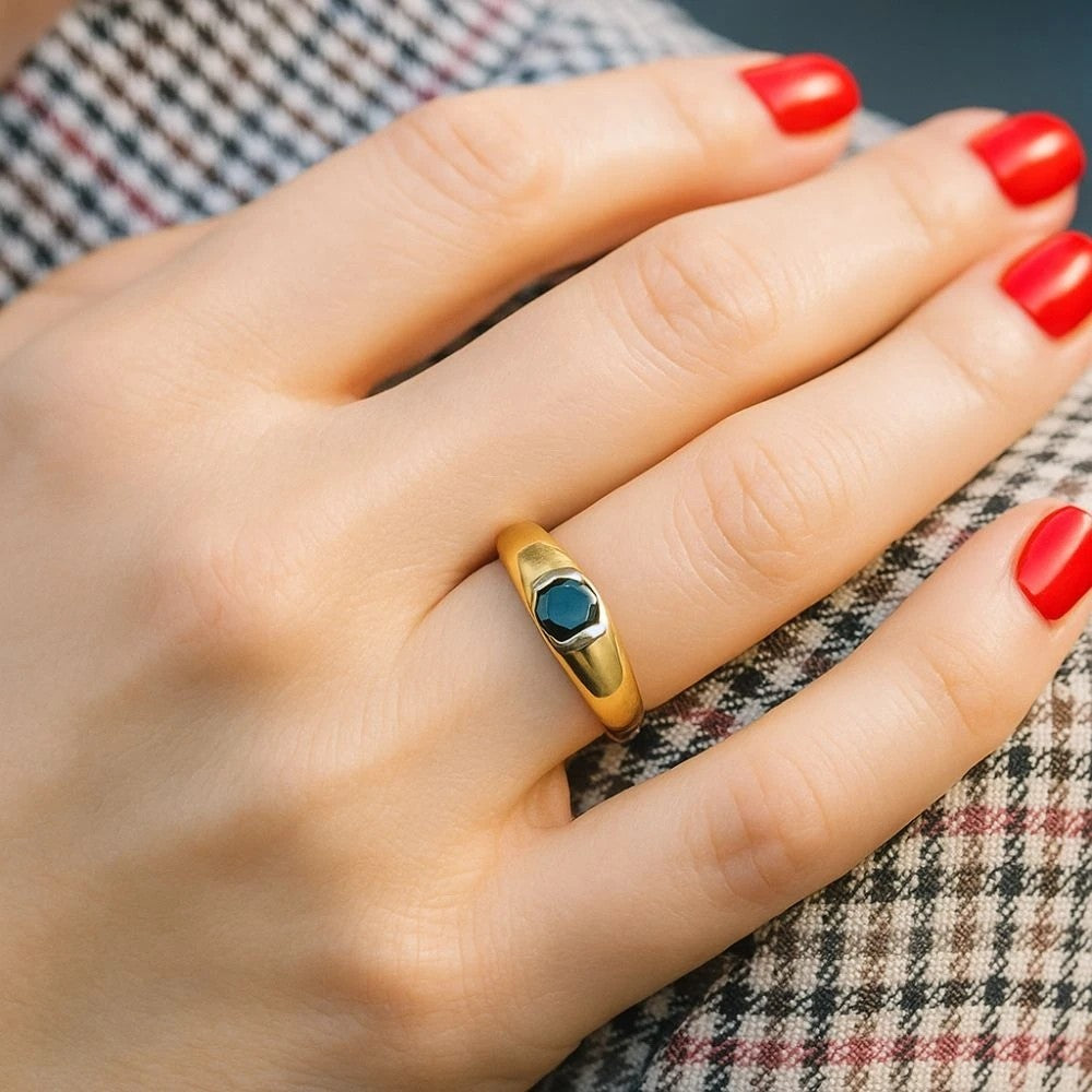 Acest inel elegant este confecționat din aur de 8K, un simbol al durabilității și al strălucirii. Greutatea aproximativa: ~2,25 - 2,57g. Piatra centrală, o zirconie neagră de dimensiuni impresionante (~ 6,0 mm), atrage atenția prin misterul și profunzimea sa. Inelul prezintă o montură rodiată pentru a evidenția piatra prețioasă și a oferi o notă de eleganță.