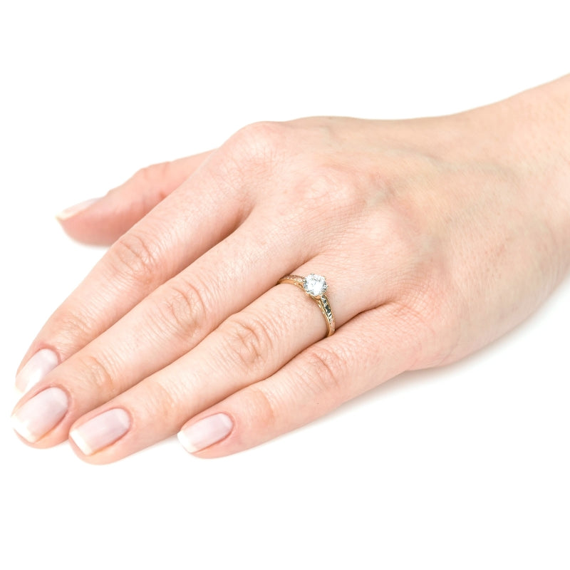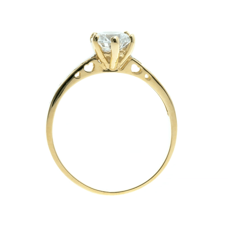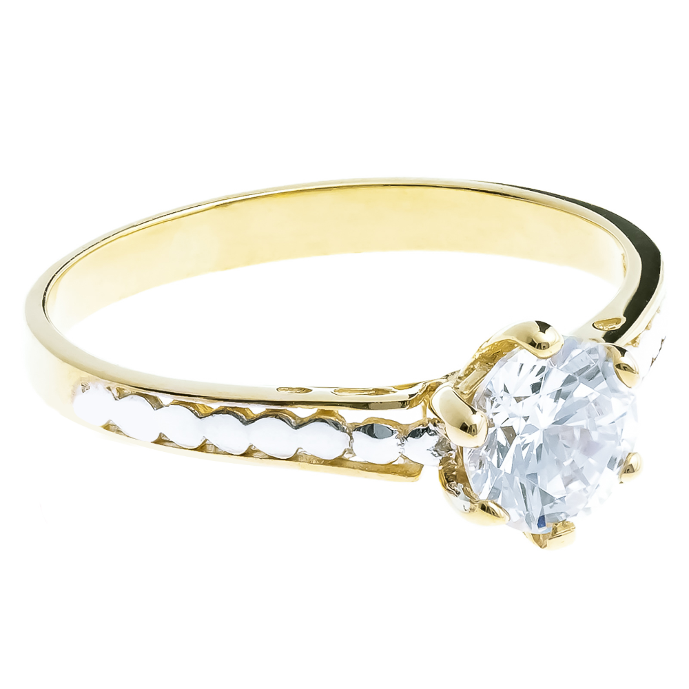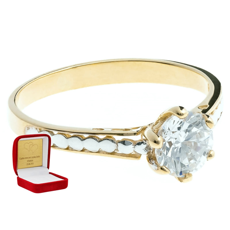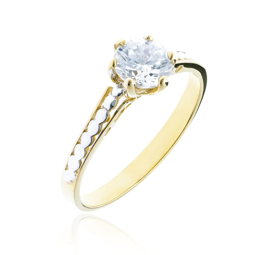 Acest inel elegant prezintă o piatră de zirconiu strălucitoare, perfect evidențiată. Designul include elemente rodiate pe laterale, adăugând un plus de sofisticare.