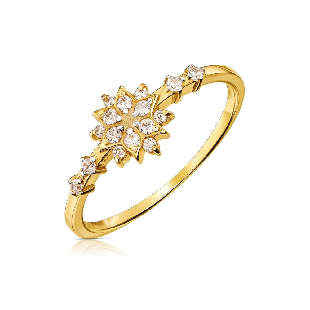 Descoperă grația și eleganța cu acest superb inel din aur, o bijuterie delicată ce celebrează frumusețea feminină. Acest inel cu design de floare, împodobit cu pietre albe sclipitoare, este o expresie a rafinamentului și a stilului atemporal.