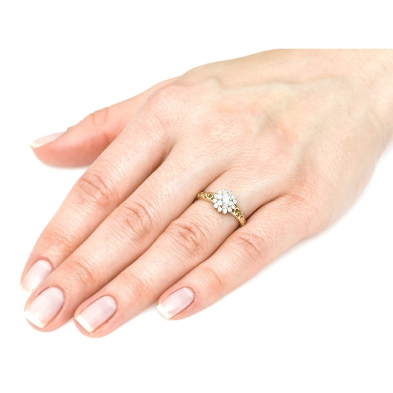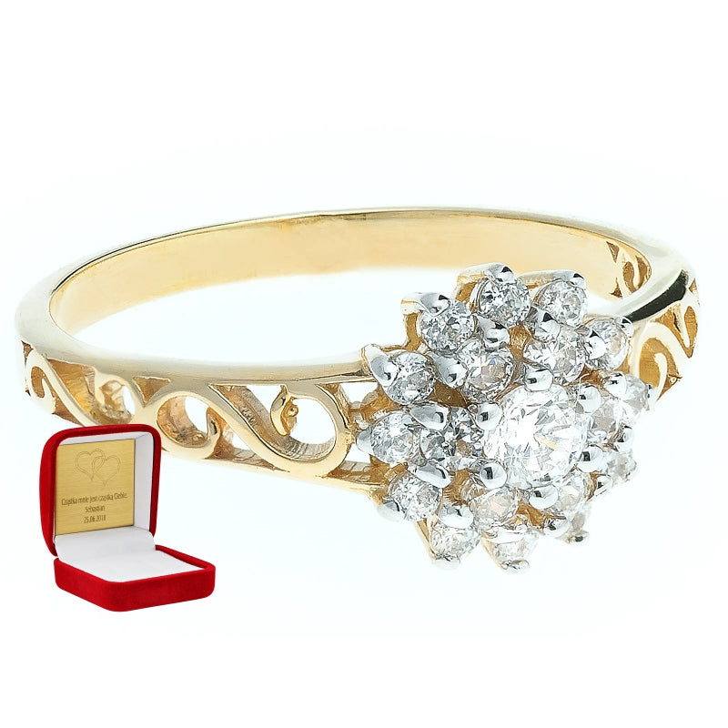 Acest inel încântător prezintă un design floral ajurat, îmbogățit cu zirconii strălucitoare, aranjate cu meticulozitate. Rodierea accentuează frumusețea zirconiilor, creând un joc subtil de lumină și eleganță. Pe deget, inelul se remarcă prin prezența sa distinctă și efectul vizual spectaculos.