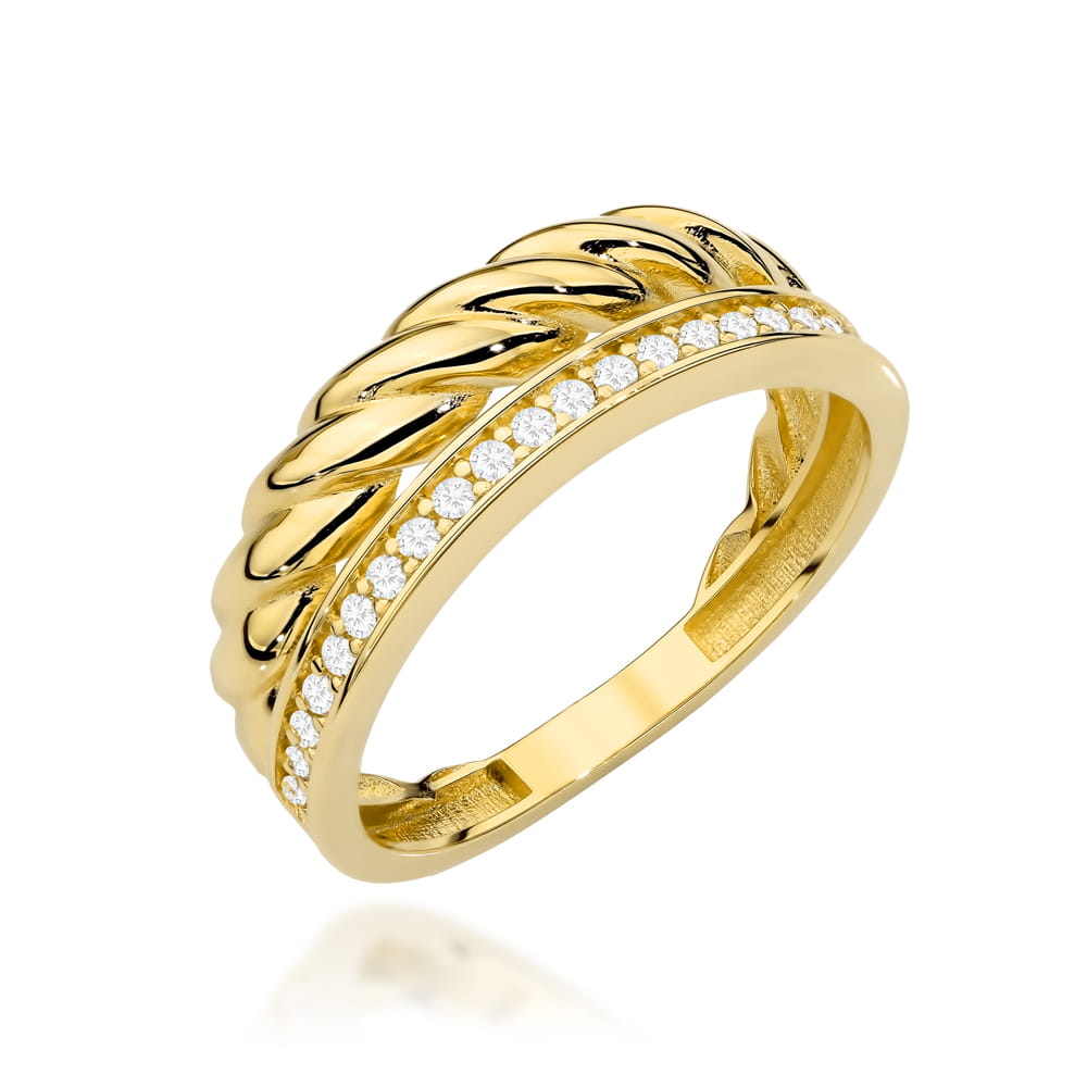 Descoperă eleganța atemporală a acestui inel din aur dublu împletit, accentuat de strălucirea subtilă a zirconilor. O bijuterie rafinată, perfectă pentru a completa orice ținută, de la cea casual la cea elegantă. Detaliile delicate ale împletiturii și strălucirea irezistibilă a pietrelor prețioase vor atrage toate privirile.