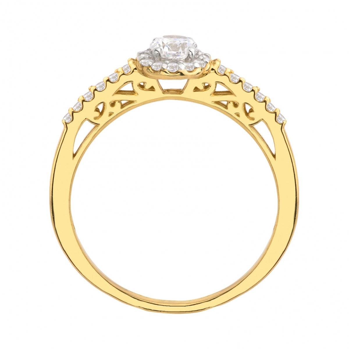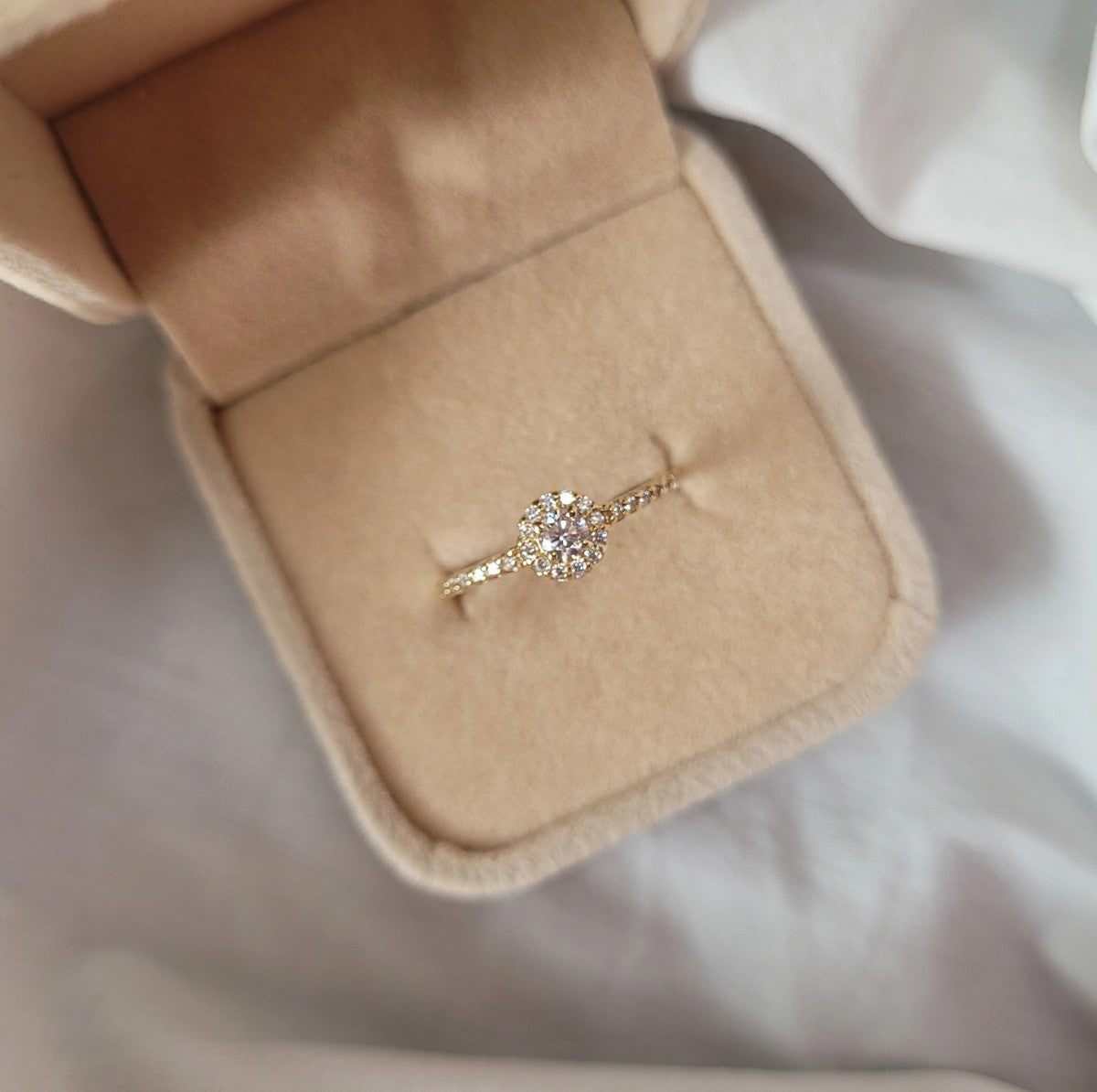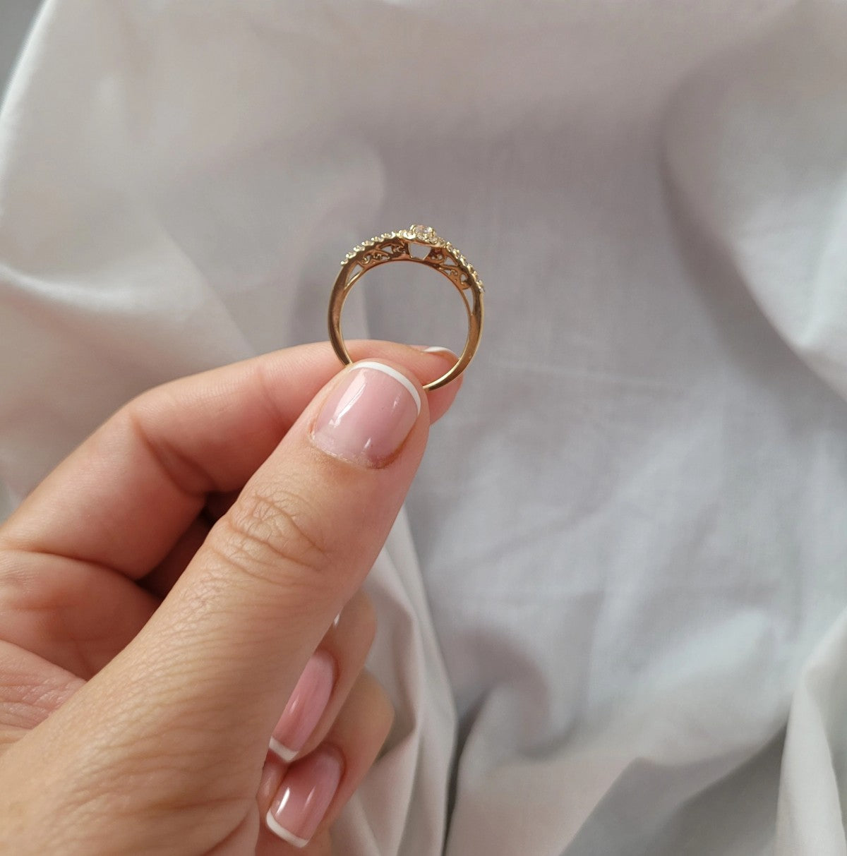 Acest inel nu este doar un accesoriu, este o declarație. Zirconiile albe, montate cu grijă, reflectă lumina într-un mod fascinant, captivând privirea și subliniind frumusețea purtătoarei. Aurul 8K conferă o notă de lux subtilă, perfectă pentru a celebra momentele speciale.