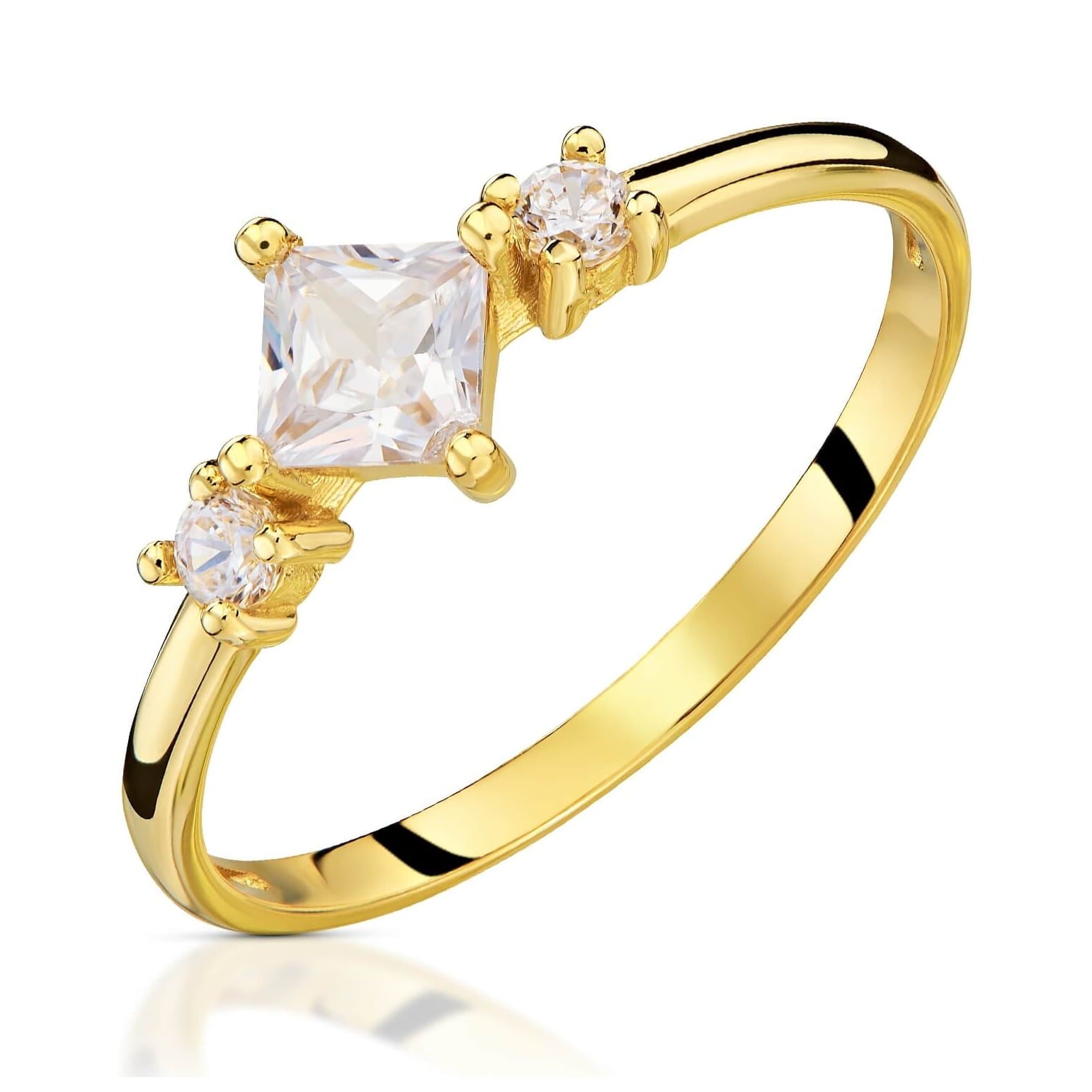 Descoperă frumusețea subtilă a acestui inel din aur 8K, modelul Eric, o bijuterie delicată, perfectă pentru a completa orice ținută cu o notă de rafinament. Inelul este decorat cu o piatră centrală de zirconiu, în formă pătrată, ce emană o strălucire subtilă, accentuată de două pietre laterale rotunde, creând un design armonios și elegant.