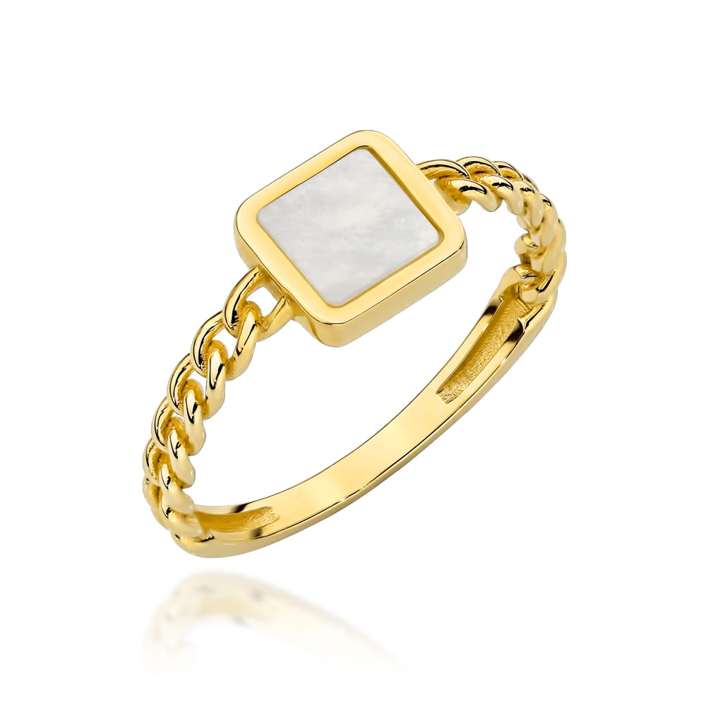 De ce să alegi această bijuterie?Alegerea acestui inel din aur cu masă perlată înseamnă a investi într-o piesă atemporală, ce adaugă o notă distinctă oricărei ținute. Designul pătrat modern, contrastând cu delicatețea sidefată a masei perlate, face din acest inel un accesoriu versatil, perfect atât pentru ocazii speciale, cât și pentru a adăuga un strop de rafinament cotidian. Este un simbol al eleganței și un cadou ideal, plin de semnificație.