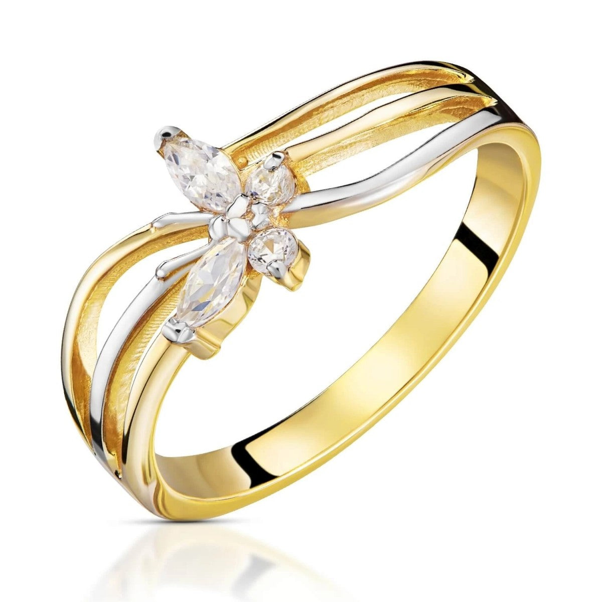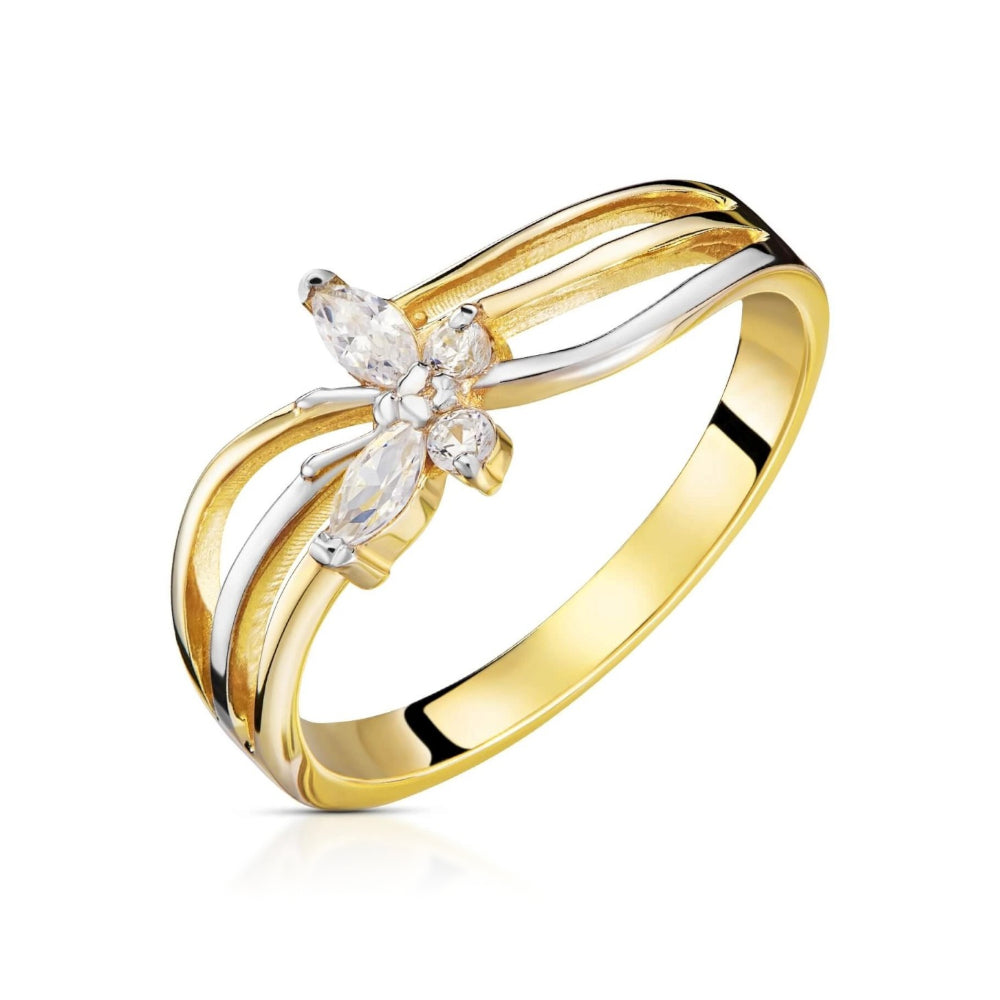 Acest inel elegant prezintă un design delicat, unde fluturele devine punctul central al atenției. Greutatea sa aproximată este între 1.96g și 2.13g, oferind o senzație confortabilă pe deget. Zirconiile, tăiate în formă de marchiză (4x2 mm) și rotunde (Ø1,7 mm), adaugă un plus de strălucire. Elemente rodiate accentuează designul, combinând aurul galben cu tonuri de alb, creând un efect vizual deosebit.