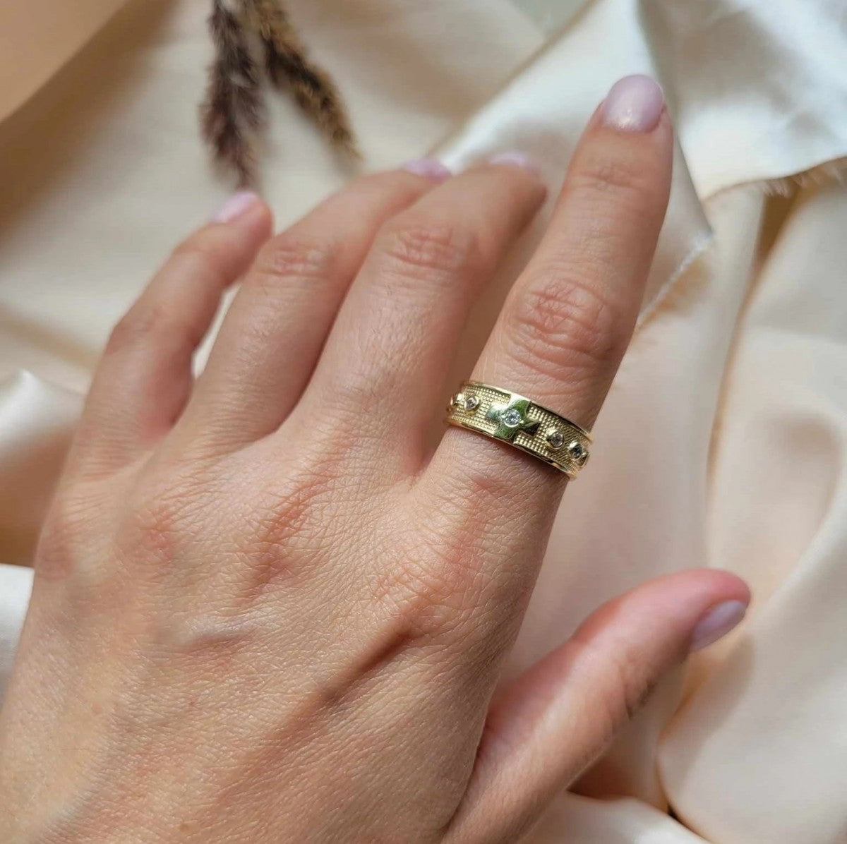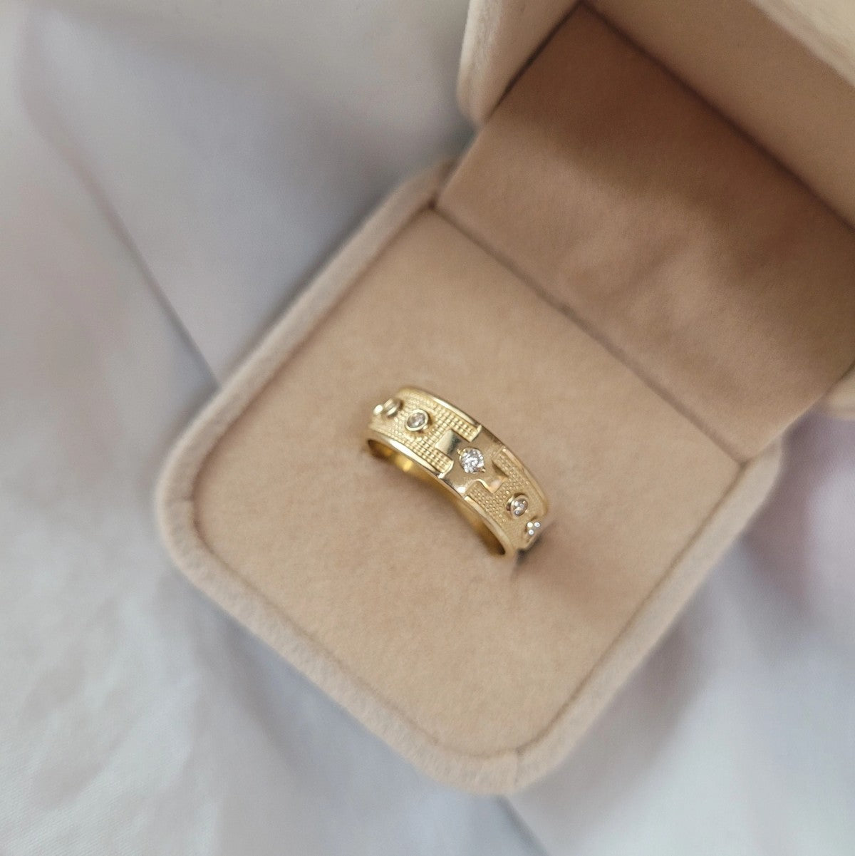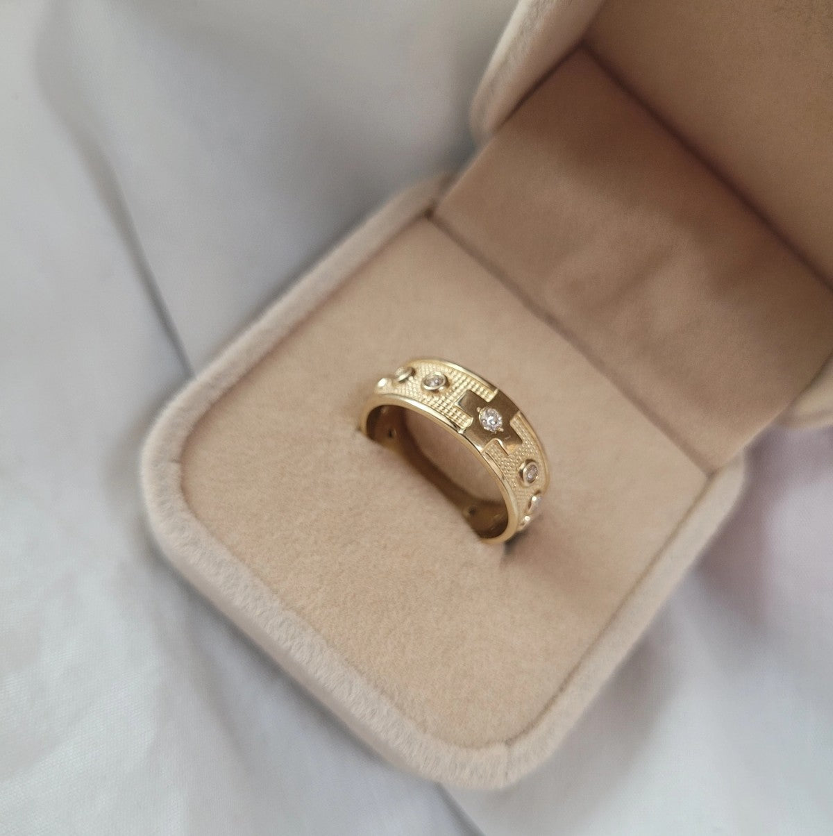Descoperă eleganța atemporală a acestui inel lat din aur 8K, o bijuterie rafinată care emană strălucire și stil. Designul său sofisticat, îmbogățit cu zirconii sclipitoare, transformă fiecare zi într-o ocazie specială.