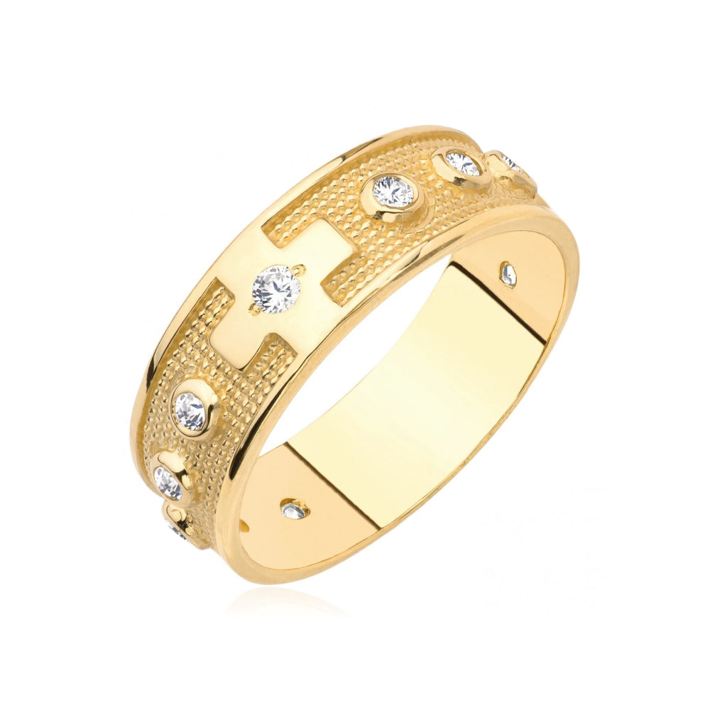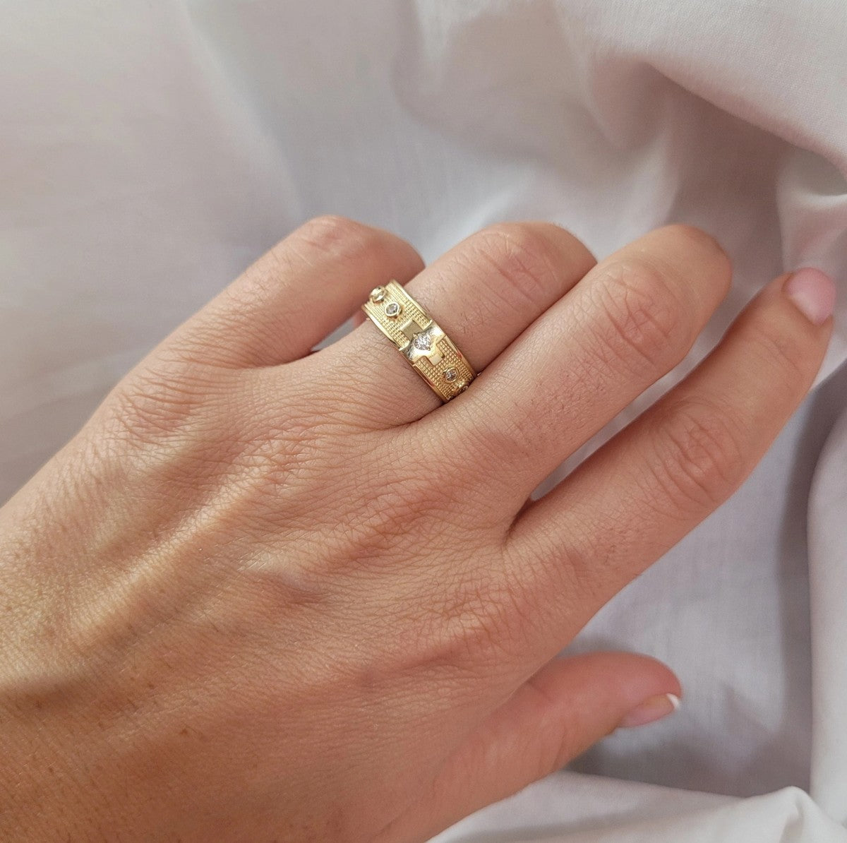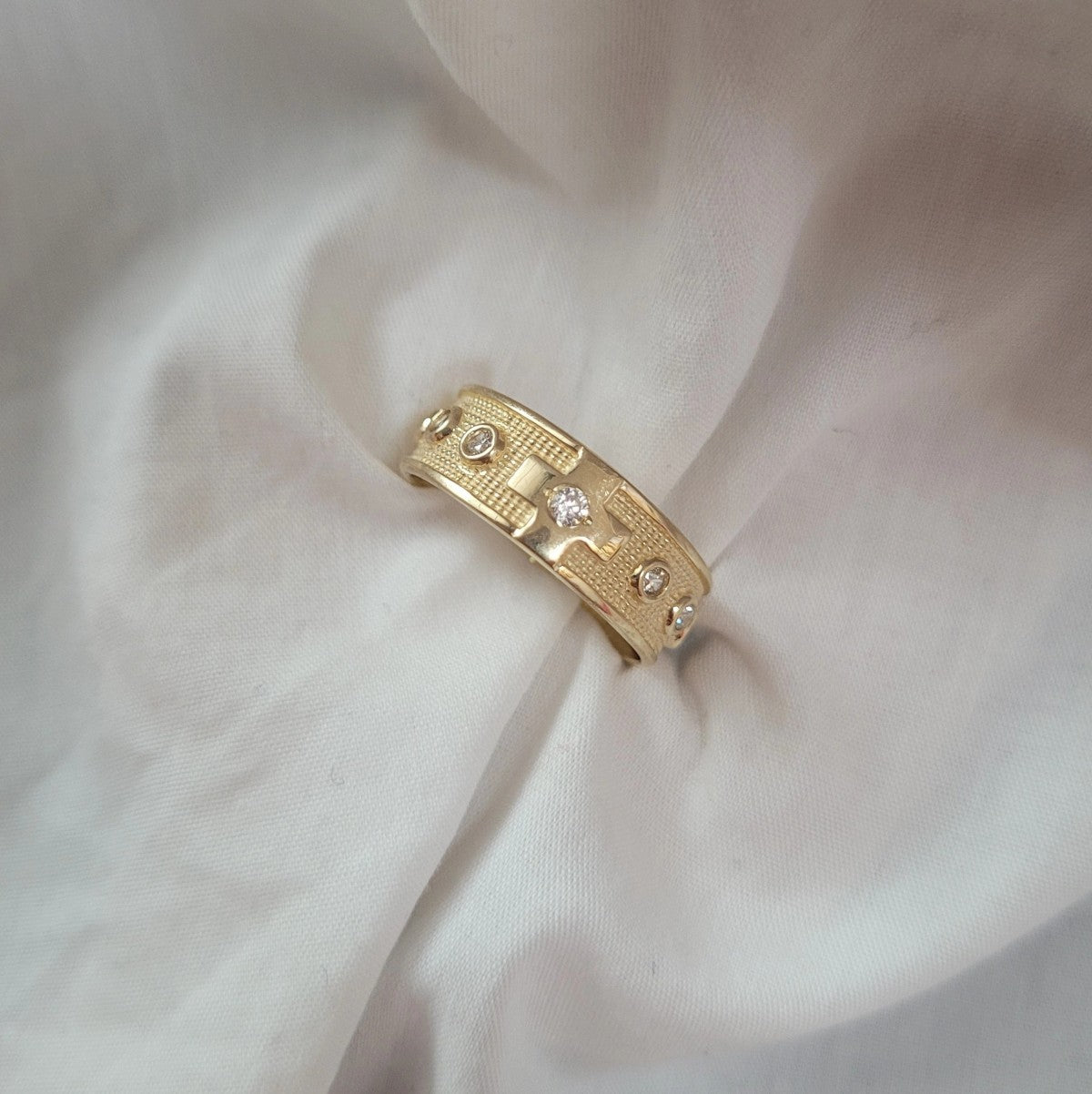 Descoperă eleganța atemporală a acestui inel lat din aur 8K, o bijuterie rafinată care emană strălucire și stil. Designul său sofisticat, îmbogățit cu zirconii sclipitoare, transformă fiecare zi într-o ocazie specială.