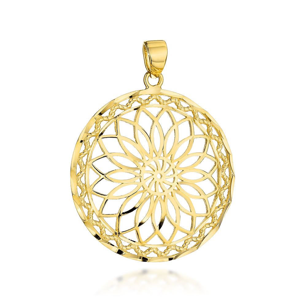 Îmbrățișați eleganța atemporală cu acest pandantiv de aur 14K, o bijuterie care emană rafinament și stil. O floare delicată, decupată cu măiestrie într-un cerc perfect, simbolizează frumusețea efemeră a naturii, capturată într-o creație permanentă.