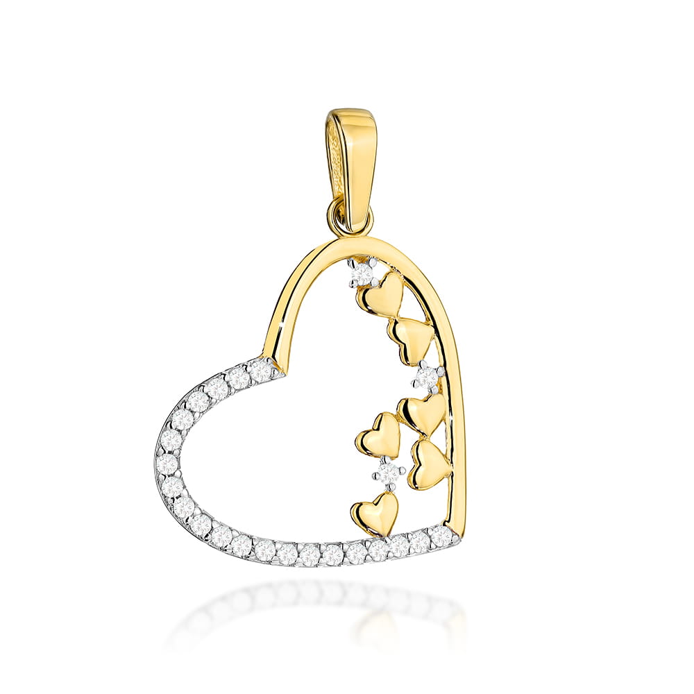 Acest pandantiv excepțional în formă de inimă, realizat din aur galben de 14K (585), este o bijuterie rafinată care celebrează eleganța și dragostea. Incrustat cu zirconii strălucitoare, designul sofisticat cu inimioare adaugă un plus de romantism și delicatețe. Perfect pentru a fi dăruit la ocazii speciale precum zile de naștere, aniversări, Ziua Îndrăgostiților sau pentru a marca un moment important din viață, acest pandantiv va deveni cu siguranță o comoară prețuită.