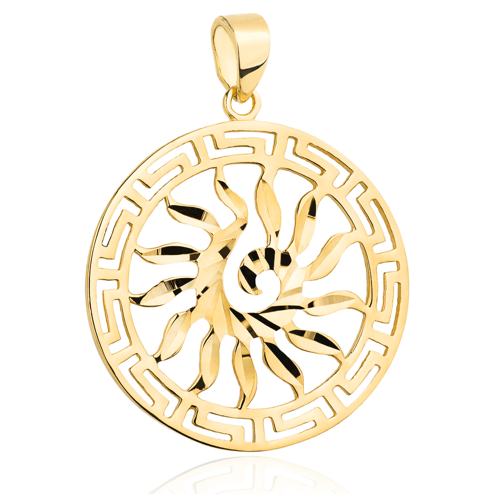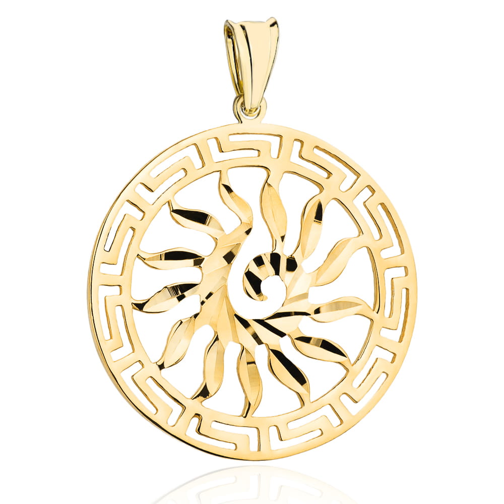 Adaugă o notă de strălucire și eleganță ținutei tale cu acest superb pandantiv cerc/soare din aur 14K (585).